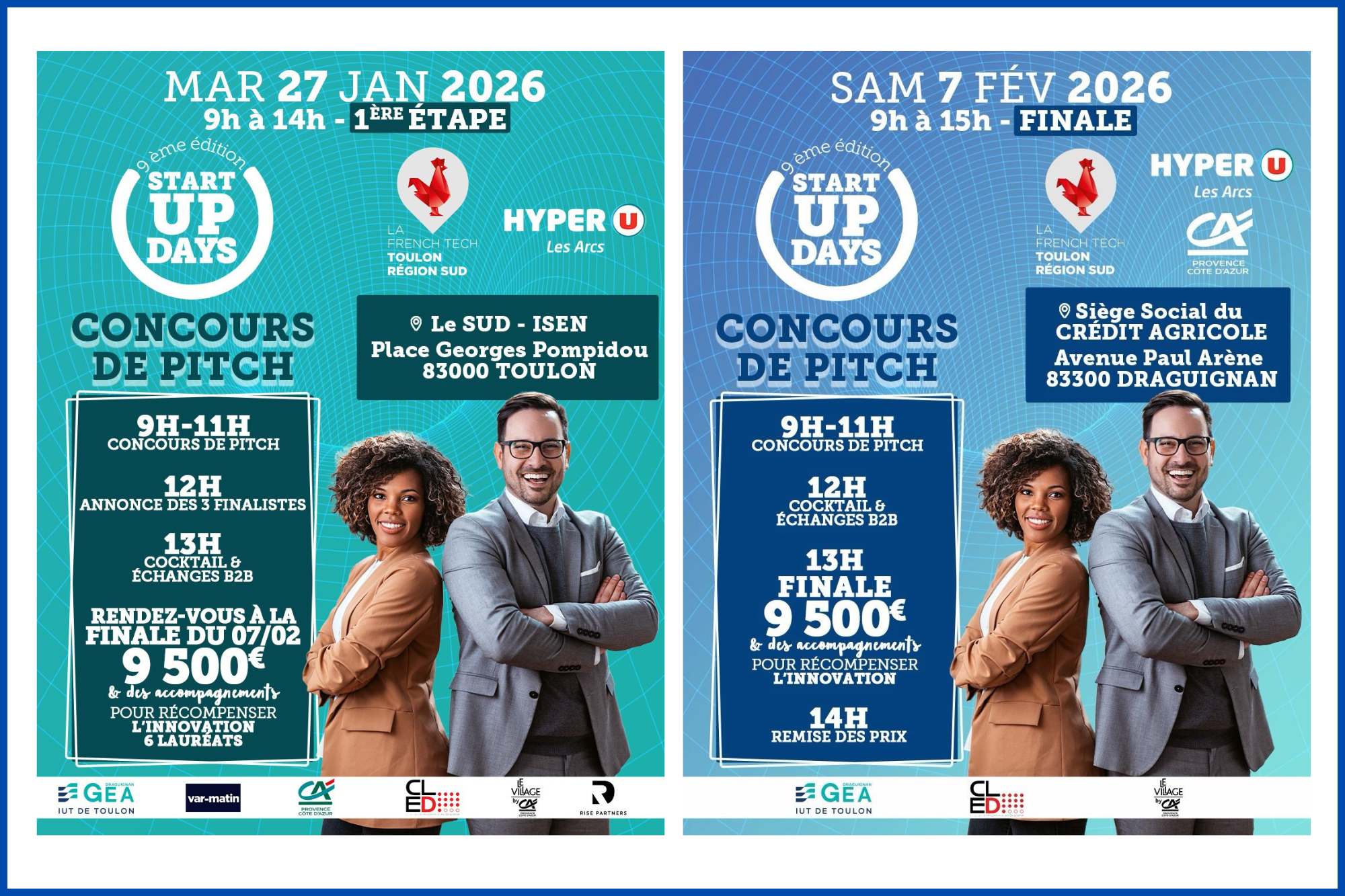 Une première journée se tiendra le Mardi 27 janvier 2026 au SUD-ISEN à Toulon. Les startups seront conviées à pitcher leur projet en 3 min. Trois finalistes seront sélectionnés et assurés de remporter un gain lors de la finale qui se déroulera au Siège Social du Crédit Agricole à Draguignan, le Samedi 7 février 2026.