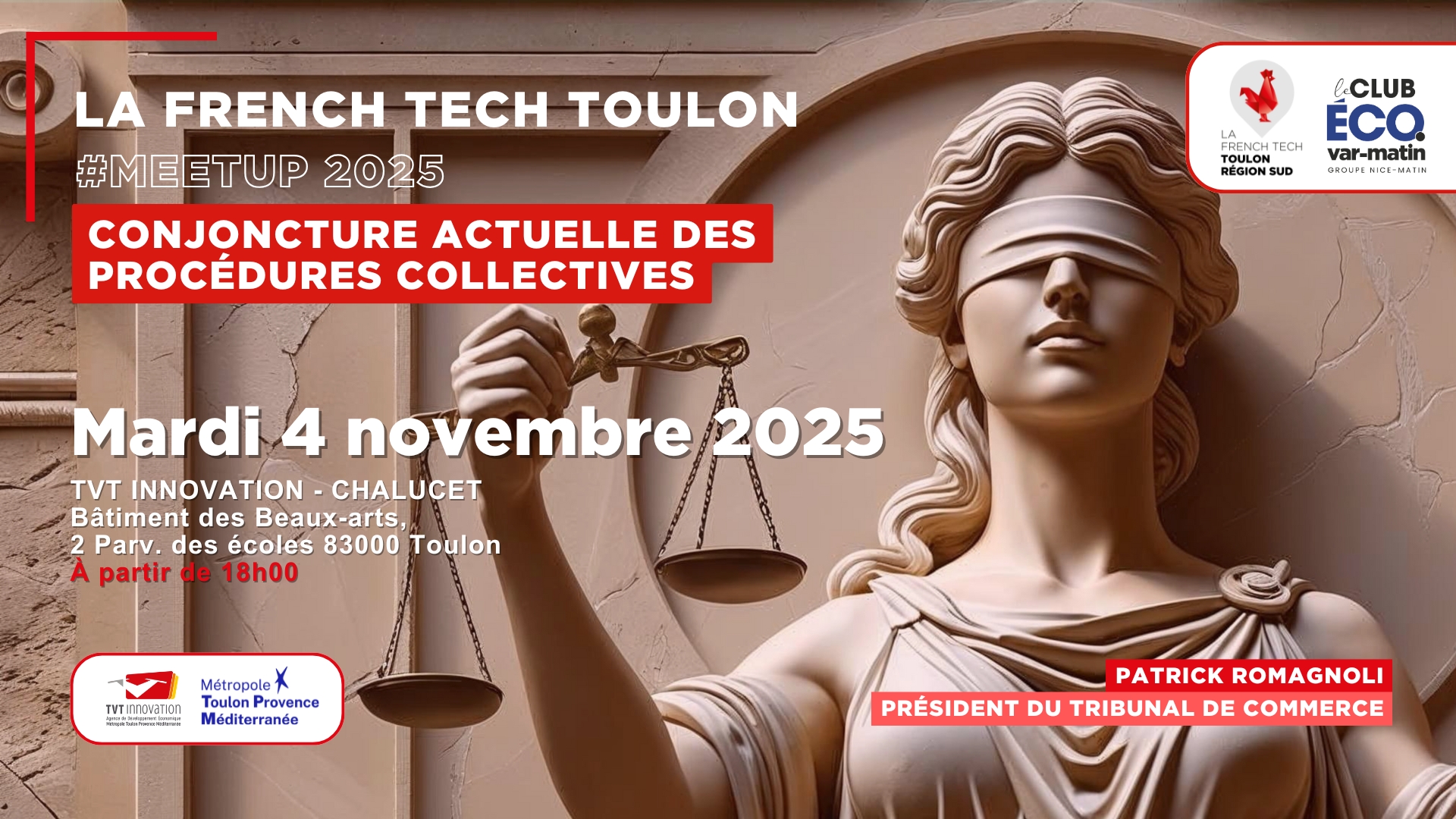 La French Tech Toulon et le Club éco Var Matin vous donnent rendez-vous le mardi 4 novembre 2025 à 18h, au bâtiment des Beaux-Arts (Chalucet, Toulon), pour une conférence dédiée à la conjoncture actuelle des procédures collectives présentée par Patrick Romagnoli président du Tribunal de Commerce.